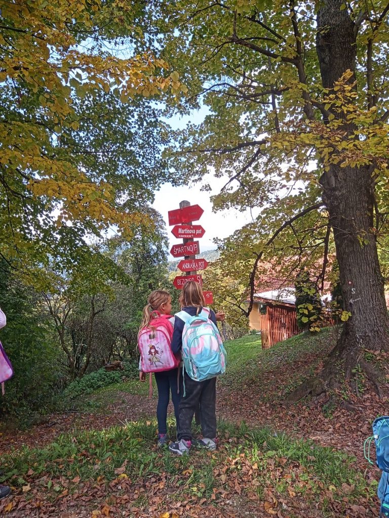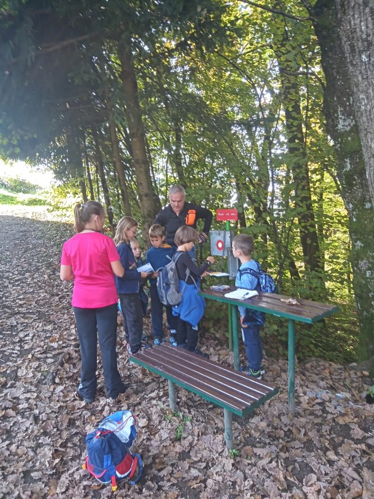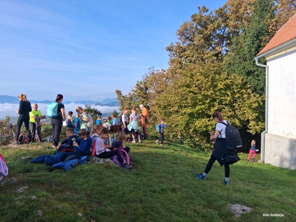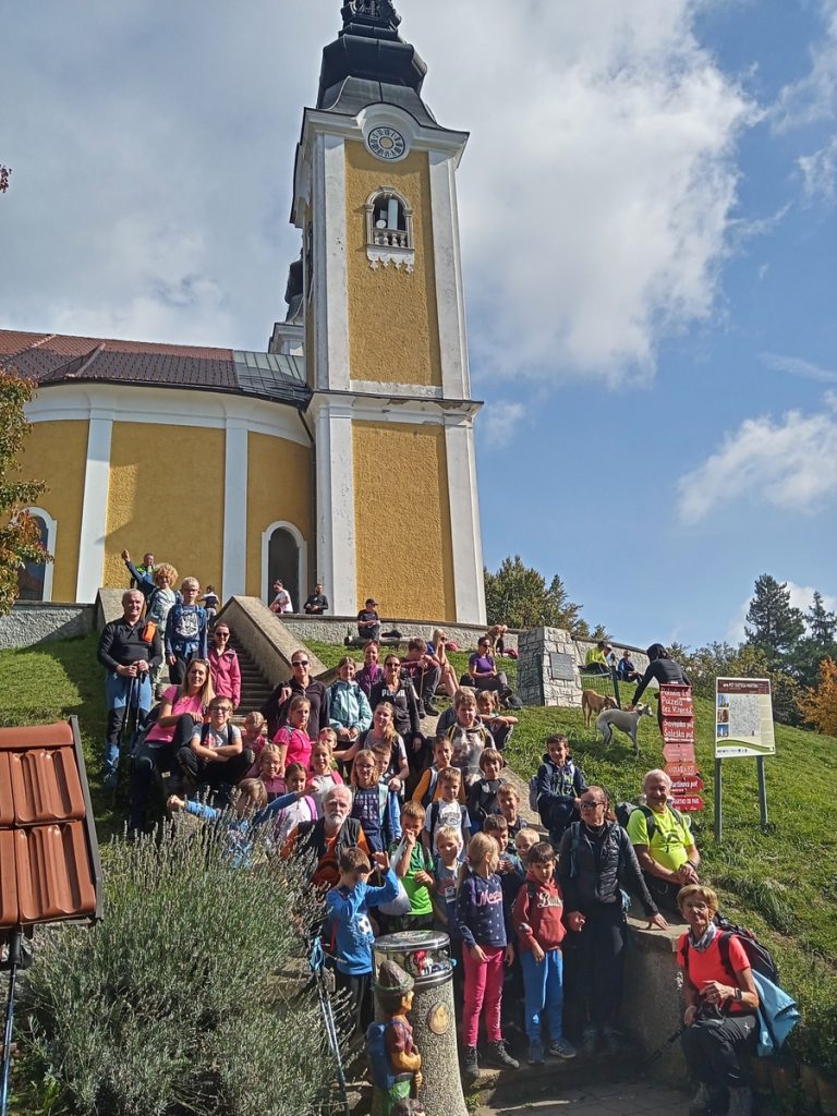 Pozno jesenska sončna sobota in prvi pravi planinski izlet v šolskem letu 2025/26. Hrib res ni visok, je pa markanten in viden že od daleč. Zbrali smo si najdaljšo pot po grebenu, čez vrh Vimperk. Takoj se je naša skupina raztegnila in še v hrib je bilo takoj treba it. Še dobro, da je ob cerkvici na Vinski gori – Vimperku bilo dovolj prostora, da smo lahko pojedli nekaj dobrot iz nahrbtnikov in se razgledali po okoliških gričih. Tudi prvi žig v knjižico Mladega planinca smo odtisnili. Pot nas je vodila mimo lepe hišice »grad turn«, ki jo krasi veliko bršljanovo srce. Potem malo po cesti in preden smo zagledali cerkev na Gori Oljki, nas je na koncu čakala zelo huda strmina. Med potjo smo nabirali kostanj in kakšna goba se je tudi našla vmes. Vrh smo osvojili točno opoldne. Še sreča, da je na njem tudi planinski dom. Eni smo poizkušali dobrote iz njihove kuhinje, eni pa dobrote iz nahrbtnika. Preden smo se spustili v dolino, smo se na cerkvenem stopnišču še slikali.