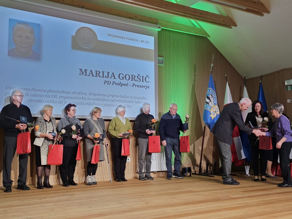 je ob svoji 80. letnici prejela SPOMINSKO PLAKETO PZS, ki jih Planinska zveza Slovenije podeljuje ob življenjskih jubilejih svojim najzaslužnejšim članom za njihovo dolgoletno zvesto in izjemno uspešno delo