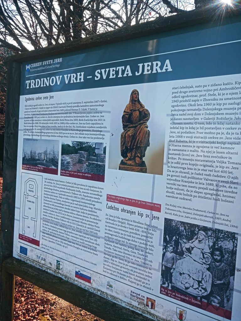 Dobro nam je šlo, ker ni prestrmo in ni bilo blata. Brez ustavljanja smo šli vse do čudežnega izvira Gospodične, kjer smo se umili. Legenda pravi da ima pomlajevalno moč. Nad izvirom se nahaja tudi planinski dom, vendar smo šli raje kar naprej proti vrhu. Slabo uro smo še potrebovali, da smo stali na njem. Od daleč nas je pozdravljal oddajnik. Na vrhu smo se fotografirali in se razgledali po okolici. Nato smo odšli do obeh cerkva. Svete Jere na naši strani in sv. Ilije na Hrvaški. Nadaljevali smo preko sv. Gere in se spustili do Doma pri Miklavžu. Priljubljena  izletniška točka pod cerkvico je bila v lepem jesenskem vremenu lepo obiskana. V bližini se nahaja prostor za oglarsko kopo. Kopišče je bilo prazno, oglje že skuhano. Pot nas je naprej vodila mimo Krvavega kamna, mesta nastanka še ene legende. Baje so pod njim živa zakopali nedolžno dekle in fanta. Od tu je bilo potrebno še malo, da smo prišli do Planinskega doma pri Gospodični, kjer smo poskusili dobrote iz njihove kuhinje.